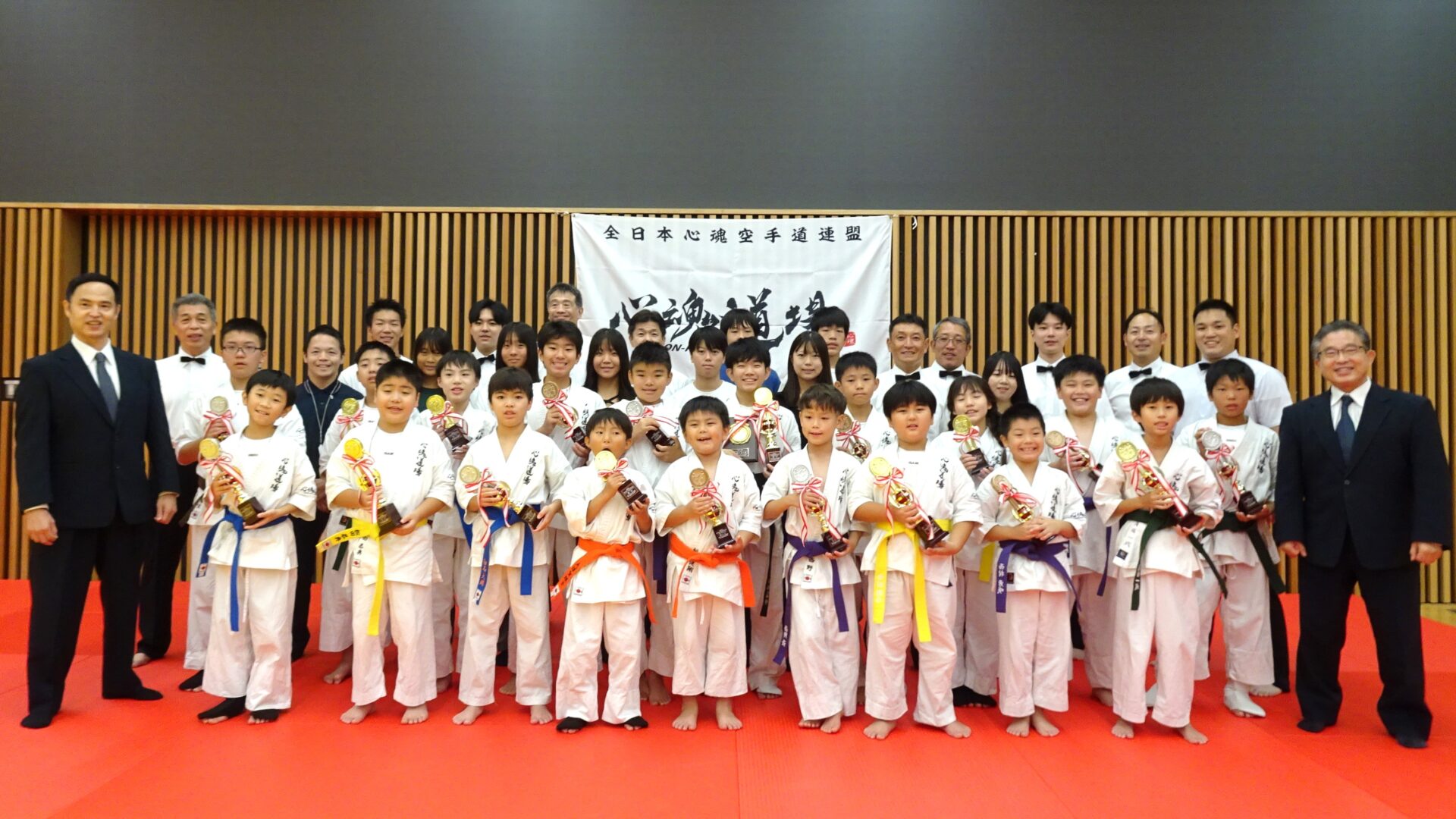 第43回 南大阪空手道交流大会 今大会には心魂道場各道場教室(・南大阪本部・堺北支部・堺東教室・三国ヶ丘教室・コスパ鳳教室・コスパさかい教室・コナミ光明池教室)より総勢44名の選手が参加し日頃の稽古の成果を競い合い白熱し