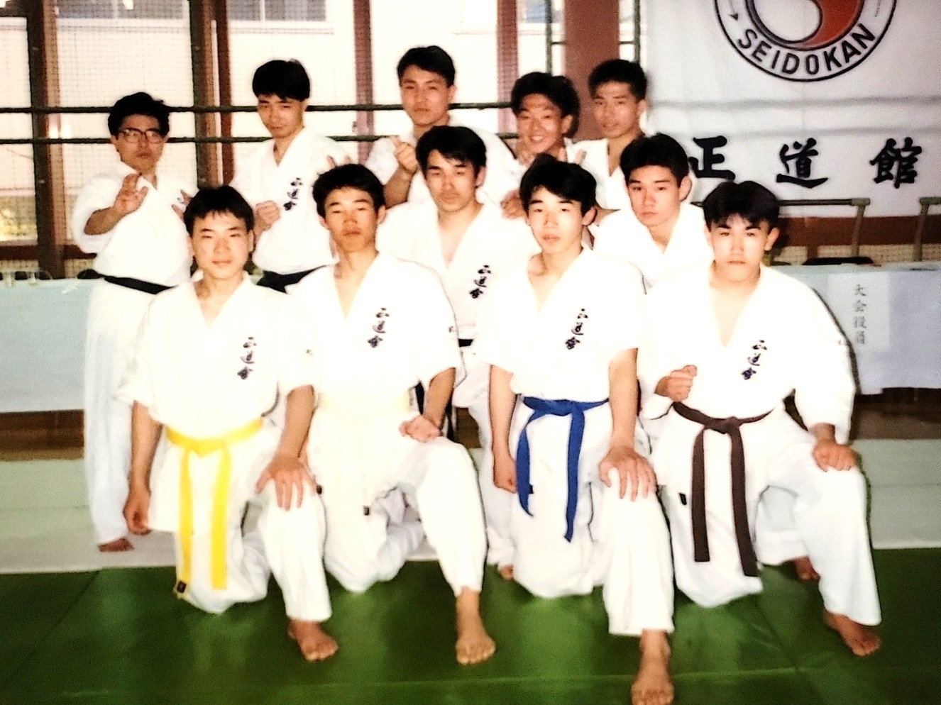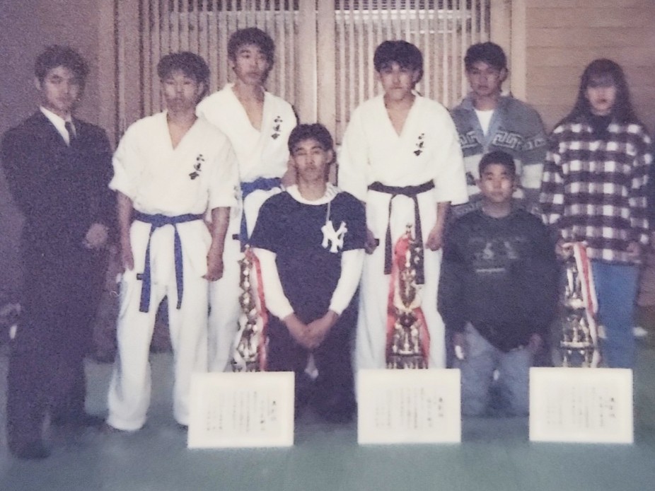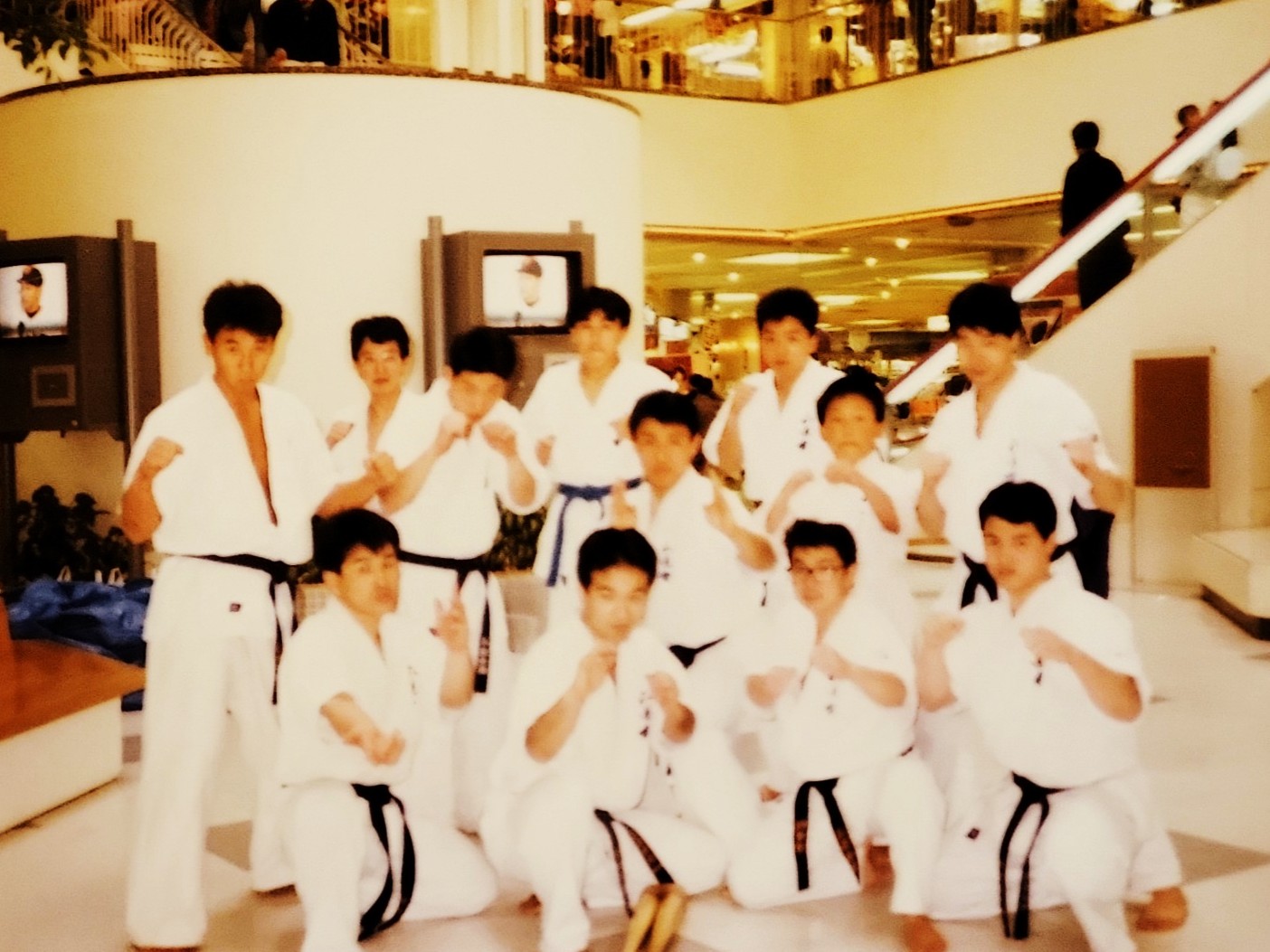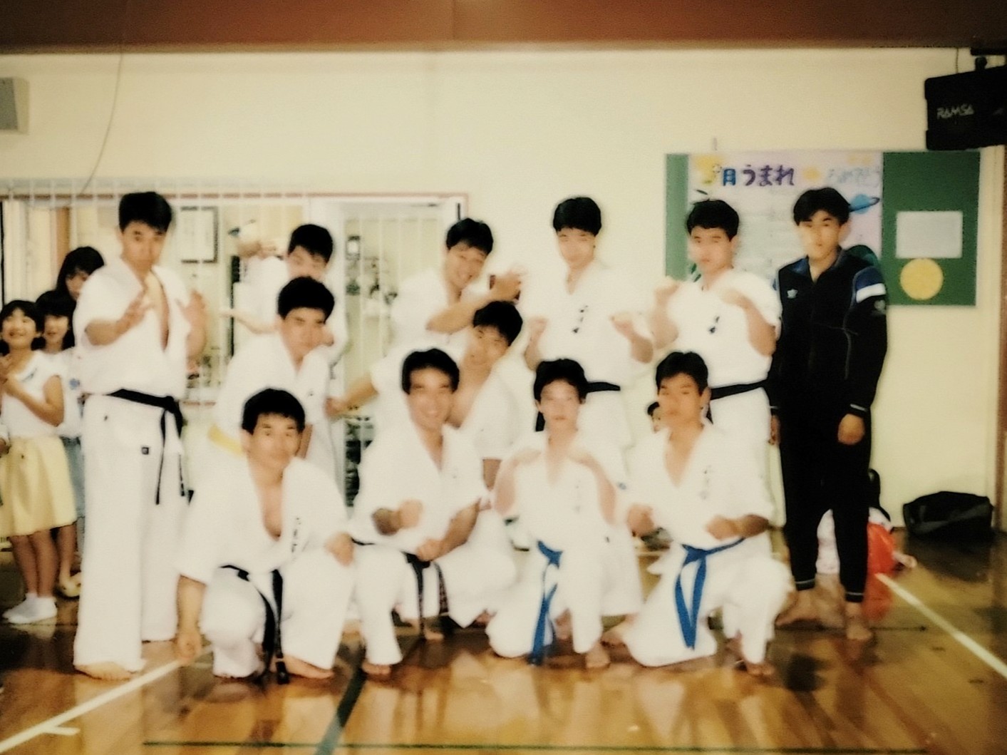 決勝戦で当時本部の内弟子だった鈴木修司(現真正会代表代行)選手と対戦し上段膝蹴りで一本勝ちをおさめ優勝しました!この時鈴木選手は頬か顎を骨折。今でも鈴木さんは当時の思い出話をする時必ずその時の話をされます。鈴木さんも認める強い選手だった事は間違いありません。実はこの日の丁度一週間程前に御座岡先生と霜出君の店に行った時の話をしていたばかりでしたので今回の事は本当に驚きました。霜出君は偶然前を通りかかった時に空手の稽古をしているのが目に入り覗き込んだら私の姿があり驚き直ぐに飛び込んできたらしいです。こんな事ってあるんですね。観ていて燃えてきたのか来ていた生徒さんと軽く手合わせやろうとするので『アカンアカン』といって咄嗟に停めました。今の生徒さんには失礼ですが『殺られる』と一瞬生徒の方が心配になりました。それぐらい当時の弟子達は強かった記憶が残っているのです。私も現役バリバリで一緒に激しい組手をバンバン行ない一番厳しく指導していた時代に付いてきていた弟子達ですからね。今はそこまで出来ないので少し寂しさもありますがこれも時代と割り切っています。膝が悪いと聞いたので難しいとは思いますが、もう少し体重を減らして軽くでもやれそうであればいつでも来て下さいね!当時の写真と思い出を紹介しておきます!