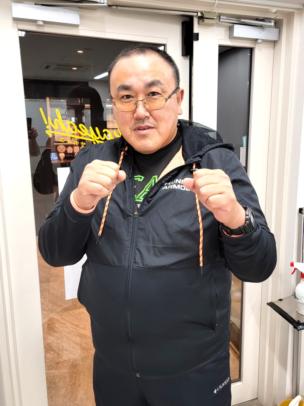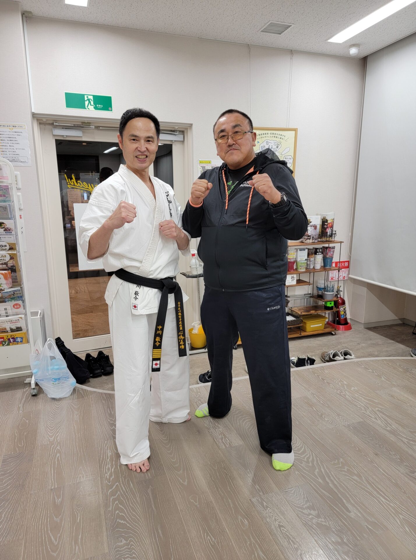 今回は青春 Karate historyの番外編です。去る11月12日(水)の南大阪本部一般部のクラス稽古終了後にドアをノックする音が聞こえました。視線をドアの方へ移すと巨大な男が立っていました。見学者と思い中に入るよう促すと『押忍!』といいます。彼が名乗ろうとする所に待ったをかけ誰だったか記憶を辿る事数十秒・・・思い出しました。念のため組手構えをしてもらい確信しました!私が高校生から24歳まで正指導員を務めていた正道会館ピープル光明池時代の最強弟子のひとり『霜出冬樹』君でした!私が知っている当時の彼は60kgそこそこのスリムな身体でしたが現在は何と120kgもあるとの事で驚きました!只それでも数十秒で分かったのは実は10年程前に彼が家族の方と経営している北野田にある有名焼き鳥屋さん『八起焼き鳥』に御座岡先生と食べに行った事がありその頃既に100kgオーバーの彼と再会していたからです。いきなりでは多分分からなかっただろうと思います(笑)。高校生の時に入門してきた彼は友人でライバルであった田島王輝君に追いつけ追い越せで一生懸命稽古をしメキメキを力を付けていきました。演武や行事時もよく手伝ってくれ助けてもらいました。後にK-1で活躍する武蔵君は年齢は同じですが霜出君の後輩になります。新人戦でも好戦績を収め、いつかの新人戦では