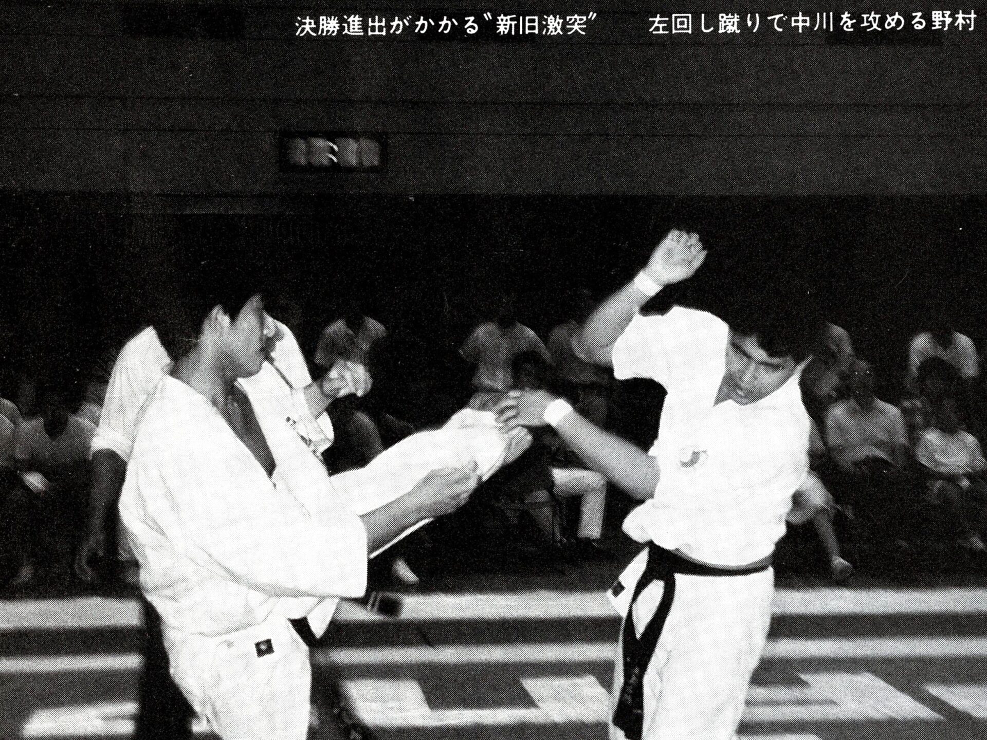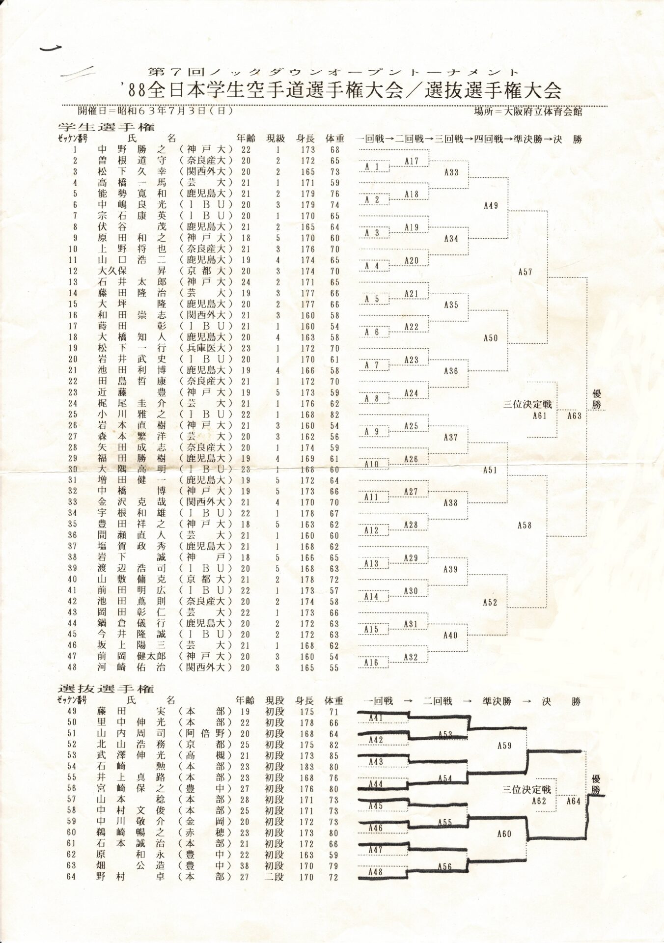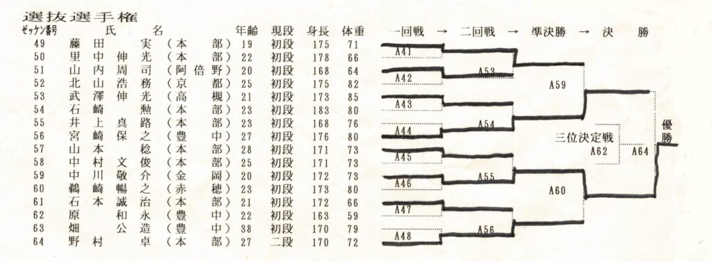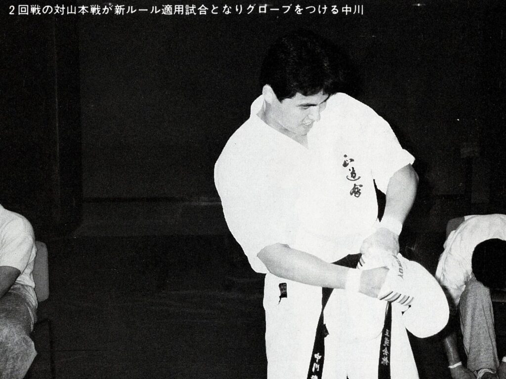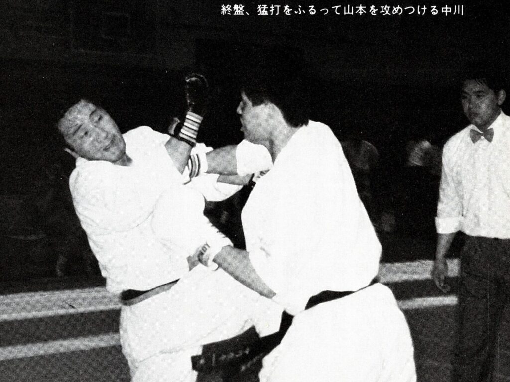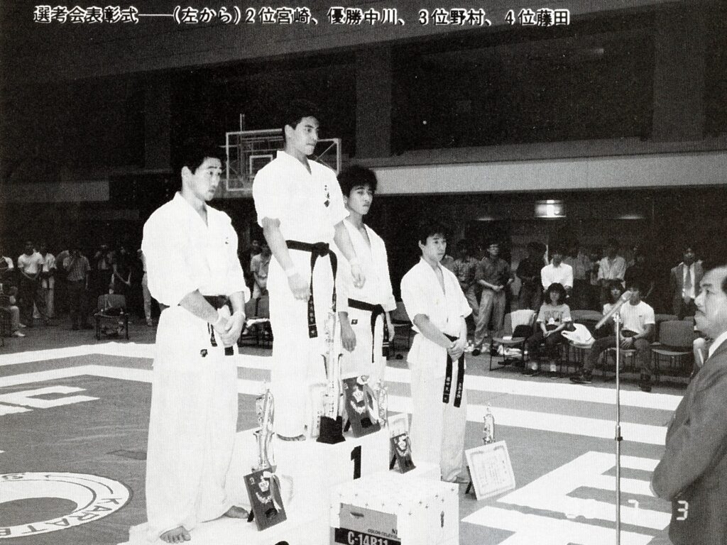 4月の大会では不甲斐ない試合をした私でしたが悔しさよりも何かプレッシャーから解放されたようで逆にやる気が漲ってきました!今までの戦績4位1回、3位3回、準優勝3回と勝ちきれていません。優勝する為には自分には何が足りないのかを良く考えました。思い返すと本番までに決めていたメニューを完全にこなした事が無い事に気づきました。どこかで体調を崩したり疲れている事を理由にノルマをこなさかったり弱めたり等色々と思い当たる節がありました。次の大会はどんな事があっても決めたメニューを全て消化する事、自分の苦手(嫌い)な稽古を優先的に行なう事、身体を鍛え直す事に重点を置くことに決めました。勿論指導も手を抜くこと無く行なっていましたよ!本番までの3ヶ月しっかりと稽古を行ない今までにないくらいの自信を持って本番を迎える事ができました!1988年7月3日大阪府立体育館第2競技場で開催される『88’正道会館全日本選抜空手道選手権大会』に出場しました。今大会は9月に開催される『第7回全日本空手道選手権大会』に向けての選考会を兼ねた大会となるのですが、今年の全日本大会より導入される新ルール(再延長戦で引き分けで両者に10㎏以上の差がない場合はグローブ着けて顔面有り有りルールで勝敗を決する)の実験の場という意味合いも兼ねた大会でした。正直このルールに合わして特にグローブを着けた稽古は殆ど行なっていませんでした。自分の中では常に顔面は想定して稽古していましたし今大会は従来の空手ルールで優勝したい気持ちが強かったです!出場選手は有段者のみ16名でしたが前大会で負けた藤田君や武澤さん石本さんや山内君という同世代の競合選手に混じり何と第3回全日本大会5位、拳武道全日本優勝の野村卓先輩や全日本6位の宮崎保之先輩がエントリーしていました。この両名の大先輩は私が中学生時に全日本大会で活躍されていたレジェンドです。3月全九州大会で同世代のレジェンド東雅美先輩に完敗しているのでここは何としてでも両先輩に勝って優勝を決め自分の殻を破りたい所です。1回戦は赤穂の鵜崎選手と対戦し終了間際に左の中段廻し蹴りで技有りを奪い判定勝ち。2回戦は私が苦手とするタイプの山本稔先輩。前に対戦した時も再延長までもつれる接戦でしたので、もしかしたら顔面までいくかな?と思っていました。案の定従来ルールでは決まらず体重判定の結果10㎏差が無いことからグローブ戦に突入しました。グローブ戦に入っても落ち着いて戦う事は出来ていたと思います。途中何回か出したフックで少し手応えを感じました。終了間際に出したフックはそんなに手応えはありませんでしたがタイミングが良かったのか山本先輩がダウンし技有りを奪え判定勝ちできました。そしていよいよ準決勝戦で『稀代のワザ師 野村卓先輩』との対戦となりました。野村先輩には本部の稽古で組手をした時にレバー打ちで効かされた事があったので警戒しました。又普段から厳しい先輩でよく怒られたりもしていましたので気持ちで負けないよう怯まないよう自分に言い聞かせました。軽量ですが多彩な技で攻めてこられ時折上段廻し蹴りが顔をかすめます。延長戦では飛び後ろ蹴りや後ろ回しの大技も使ってこられました。何とか凌いで再延長戦へ突入。両者掴みが多いとの事で上衣を脱がされます。逆にこれで突きがよく出るようになりました。中盤から右の下段廻し蹴りもいい感じで入るようになり終盤先輩に少し疲れがみえたところを責め立て判定勝ちを収める事ができました。そして決勝戦逆ブロックで2回戦で武澤さん準決勝戦で藤田君という同世代の強豪たちを破り勝ち上がってきたのはもう一人のレジェンド『静かなる武人 宮崎保之先輩』でした。仲間たちが次々に敗れるのを目の当たりにしてここは絶対に俺が勝手世代交代をするぞ!と強い気持ちをもって決勝戦に臨みました。宮崎先輩は手足が大きく骨が太く一発一発がとても重く強かったです。何とか耐えながら先輩のパワーにもっていかれないよう技と手数、気合で負けないよう対抗しました。延長戦の後半に野村先輩との準決勝でよく出た右の下段が出るようになりましたが宮崎先輩の手数も落ちません。延長戦も引き分けとなり再延長戦へ。今大会かなり延長戦を戦ってますが九州大会の時ようなしんどさはありません。むしろ気持ちが充実していて闘争心が落ちることはありません。教え子の子供たちの声援もとても良く聞こえ冷静さもありました。『ここまできたら絶対に優勝するぞ!子供達のためにも負けないぞ!』と自分に言い聞かせました。再延長戦に入っても宮崎先輩の動きは落ちませんが自分も絶対に引けません。後半は宮崎先輩を何回か場外に押し出す事もあり正直『勝てた!』と思いました…。が判定は副審1名と主審が支持してくれましたが結果は非情にも2-0で引き分け…。『またか…』嫌な予感が頭を過りましたが体重測定の結果中川72kg、宮崎先輩83kgで10kg差があ