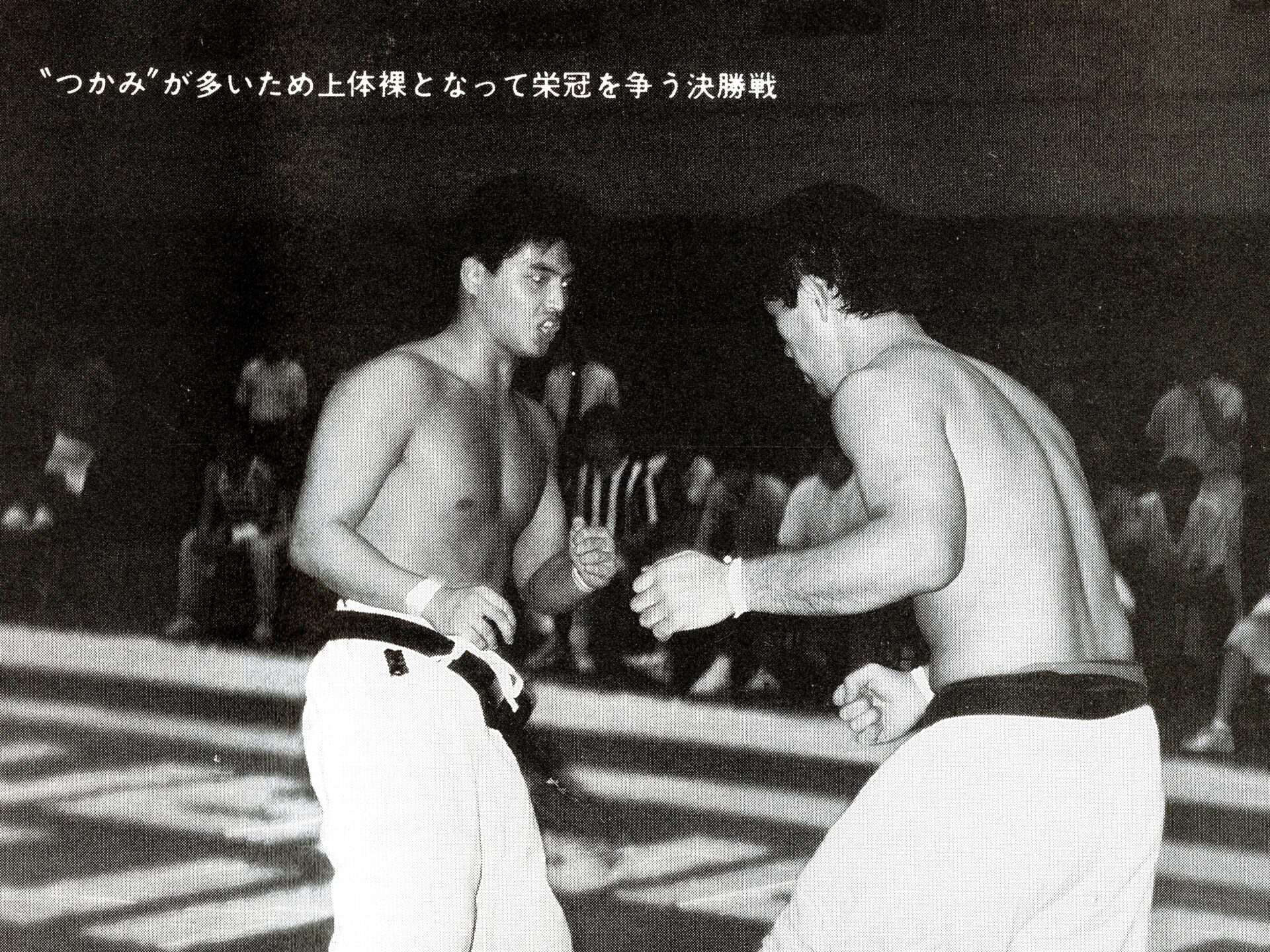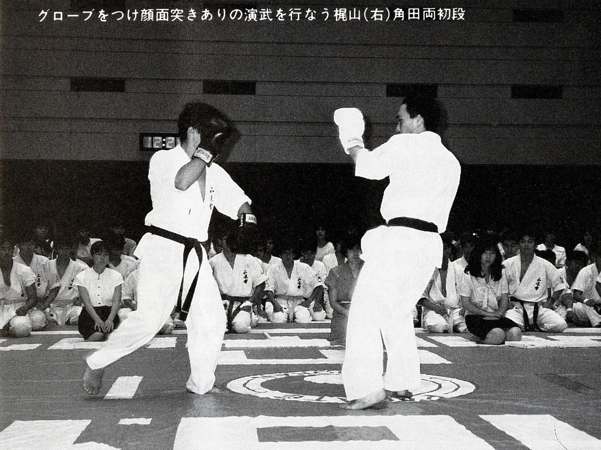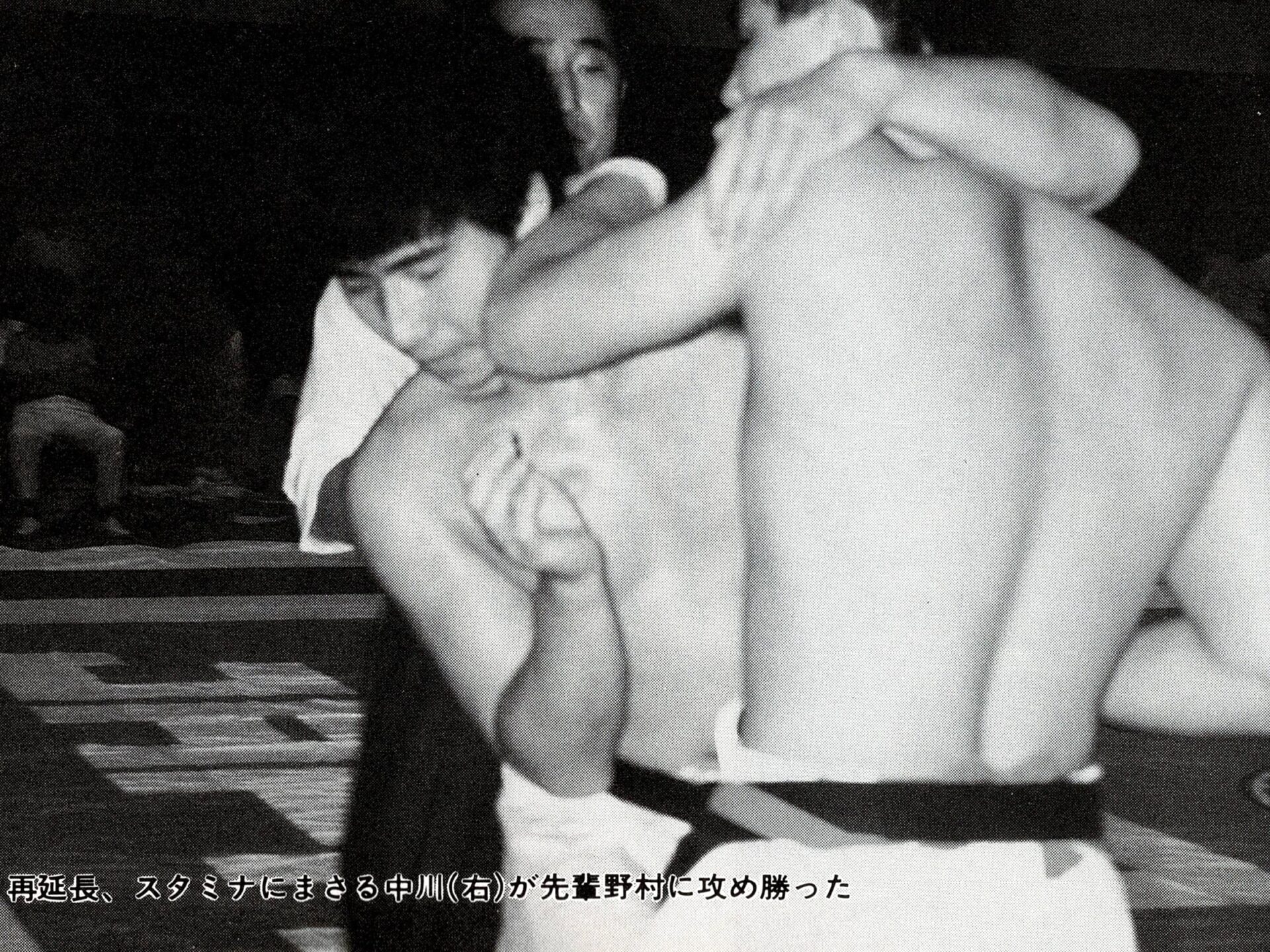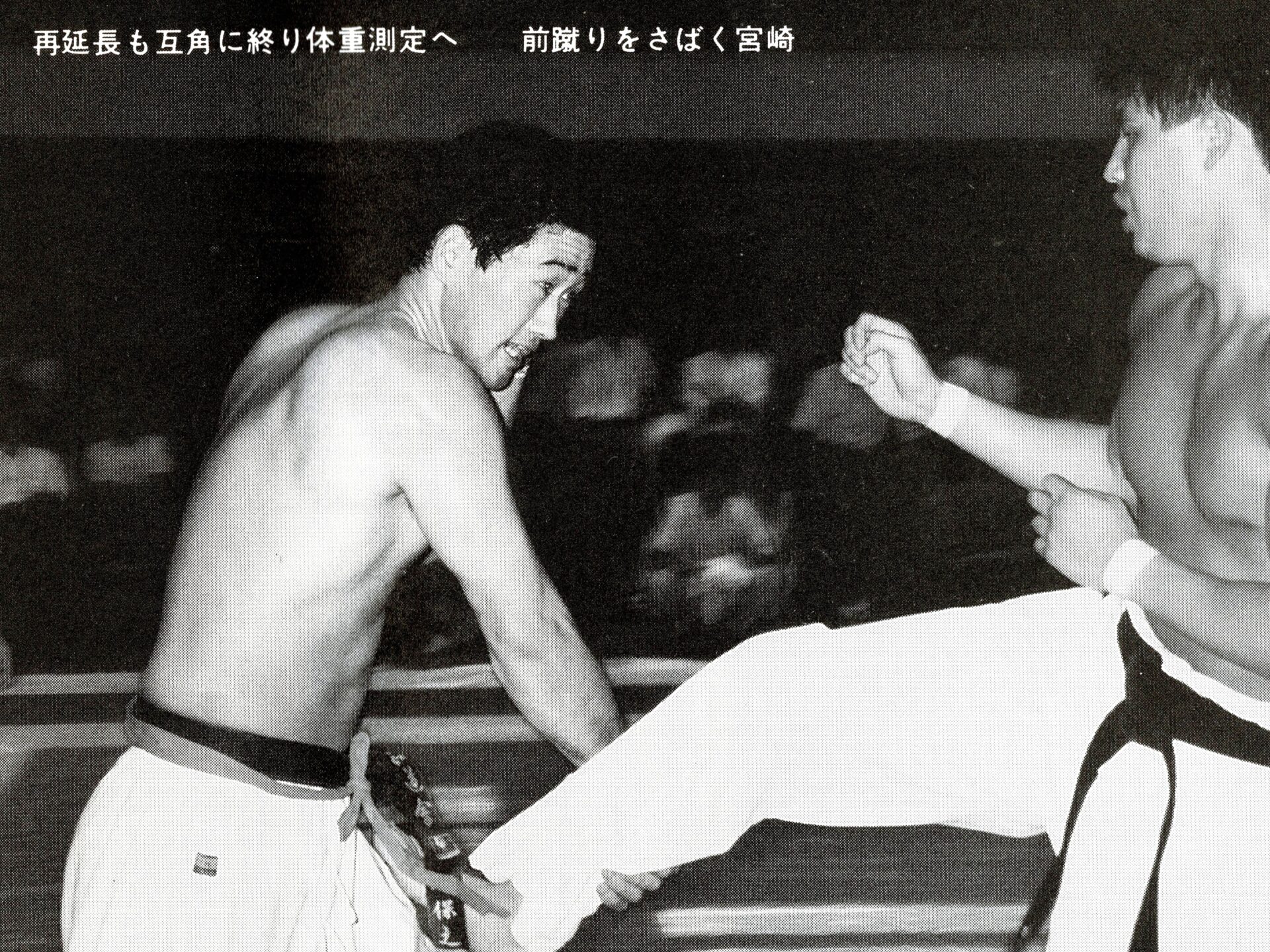 4月の大会では不甲斐ない試合をした私でしたが悔しさよりも何かプレッシャーから解放されたようで逆にやる気が漲ってきました!今までの戦績4位1回、3位3回、準優勝3回と勝ちきれていません。優勝する為には自分には何が足りないのかを良く考えました。思い返すと本番までに決めていたメニューを完全にこなした事が無い事に気づきました。どこかで体調を崩したり疲れている事を理由にノルマをこなさかったり弱めたり等色々と思い当たる節がありました。次の大会はどんな事があっても決めたメニューを全て消化する事、自分の苦手(嫌い)な稽古を優先的に行なう事、身体を鍛え直す事に重点を置くことに決めました。勿論指導も手を抜くこと無く行なっていましたよ!本番までの3ヶ月しっかりと稽古を行ない今までにないくらいの自信を持って本番を迎える事ができました!1988年7月3日大阪府立体育館第2競技場で開催される『88’正道会館全日本選抜空手道選手権大会』に出場しました。今大会は9月に開催される『第7回全日本空手道選手権大会』に向けての選考会を兼ねた大会となるのですが、今年の全日本大会より導入される新ルール(再延長戦で引き分けで両者に10㎏以上の差がない場合はグローブ着けて顔面有り有りルールで勝敗を決する)の実験の場という意味合いも兼ねた大会でした。正直このルールに合わして特にグローブを着けた稽古は殆ど行なっていませんでした。自分の中では常に顔面は想定して稽古していましたし今大会は従来の空手ルールで優勝したい気持ちが強かったです!出場選手は有段者のみ16名でしたが前大会で負けた藤田君や武澤さん石本さんや山内君という同世代の競合選手に混じり何と第3回全日本大会5位、拳武道全日本優勝の野村卓先輩や全日本6位の宮崎保之先輩がエントリーしていました。この両名の大先輩は私が中学生時に全日本大会で活躍されていたレジェンドです。3月全九州大会で同世代のレジェンド東雅美先輩に完敗しているのでここは何としてでも両先輩に勝って優勝を決め自分の殻を破りたい所です。1回戦は赤穂の鵜崎選手と対戦し終了間際に左の中段廻し蹴りで技有りを奪い判定勝ち。2回戦は私が苦手とするタイプの山本稔先輩。前に対戦した時も再延長までもつれる接戦でしたので、もしかしたら顔面までいくかな?と思っていました。案の定従来ルールでは決まらず体重判定の結果10㎏差が無いことからグローブ戦に突入しました。グローブ戦に入っても落ち着いて戦う事は出来ていたと思います。途中何回か出したフックで少し手応えを感じました。終了間際に出したフックはそんなに手応えはありませんでしたがタイミングが良かったのか山本先輩がダウンし技有りを奪え判定勝ちできました。そしていよいよ準決勝戦で『稀代のワザ師 野村卓先輩』との対戦となりました。野村先輩には本部の稽古で組手をした時にレバー打ちで効かされた事があったので警戒しました。又普段から厳しい先輩でよく怒られたりもしていましたので気持ちで負けないよう怯まないよう自分に言い聞かせました。軽量ですが多彩な技で攻めてこられ時折上段廻し蹴りが顔をかすめます。延長戦では飛び後ろ蹴りや後ろ回しの大技も使ってこられました。何とか凌いで再延長戦へ突入。両者掴みが多いとの事で上衣を脱がされます。逆にこれで突きがよく出るようになりました。中盤から右の下段廻し蹴りもいい感じで入るようになり終盤先輩に少し疲れがみえたところを責め立て判定勝ちを収める事ができました。そして決勝戦逆ブロックで2回戦で武澤さん準決勝戦で藤田君という同世代の強豪たちを破り勝ち上がってきたのはもう一人のレジェンド『静かなる武人 宮崎保之先輩』でした。仲間たちが次々に敗れるのを目の当たりにしてここは絶対に俺が勝手世代交代をするぞ!と強い気持ちをもって決勝戦に臨みました。宮崎先輩は手足が大きく骨が太く一発一発がとても重く強かったです。何とか耐えながら先輩のパワーにもっていかれないよう技と手数、気合で負けないよう対抗しました。延長戦の後半に野村先輩との準決勝でよく出た右の下段が出るようになりましたが宮崎先輩の手数も落ちません。延長戦も引き分けとなり再延長戦へ。今大会かなり延長戦を戦ってますが九州大会の時ようなしんどさはありません。むしろ気持ちが充実していて闘争心が落ちることはありません。教え子の子供たちの声援もとても良く聞こえ冷静さもありました。『ここまできたら絶対に優勝するぞ!子供達のためにも負けないぞ!』と自分に言い聞かせました。再延長戦に入っても宮崎先輩の動きは落ちませんが自分も絶対に引けません。後半は宮崎先輩を何回か場外に押し出す事もあり正直『勝てた!』と思いました…。が判定は副審1名と主審が支持してくれましたが結果は非情にも2-0で引き分け…。『またか…』嫌な予感が頭を過りましたが体重測定の結果中川72kg、宮崎先輩83kgで10kg差があ