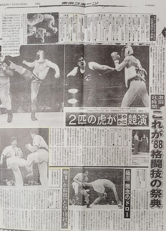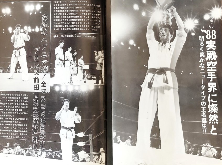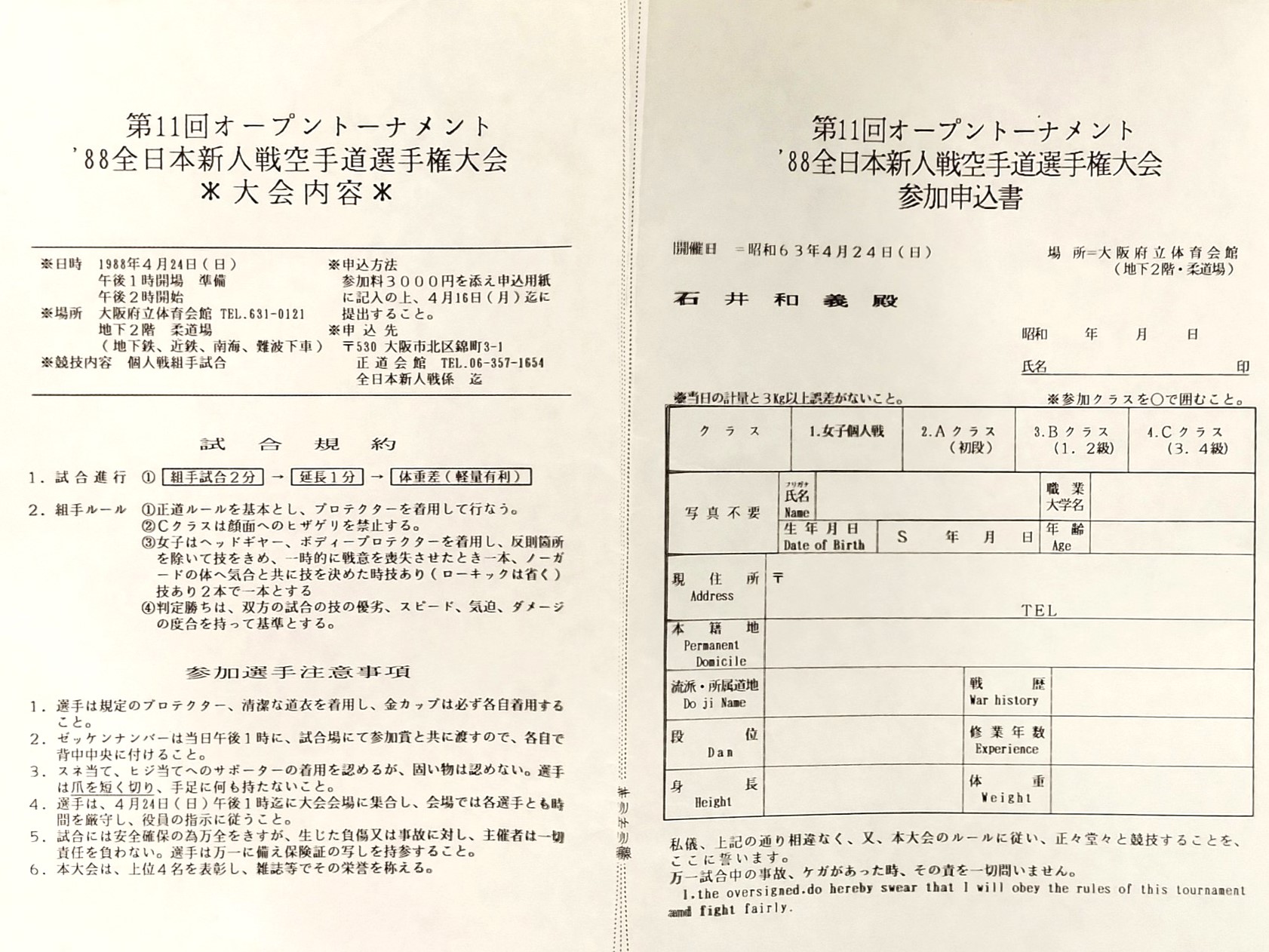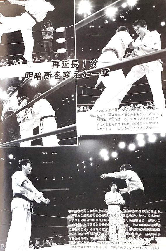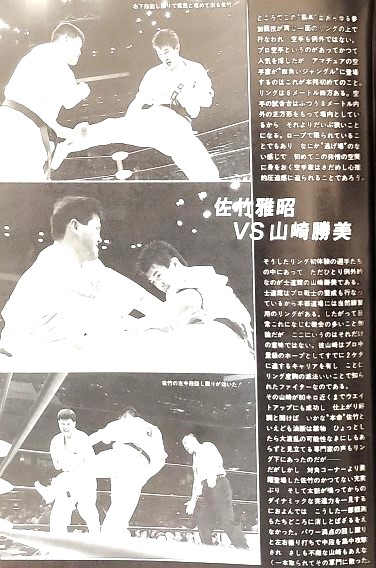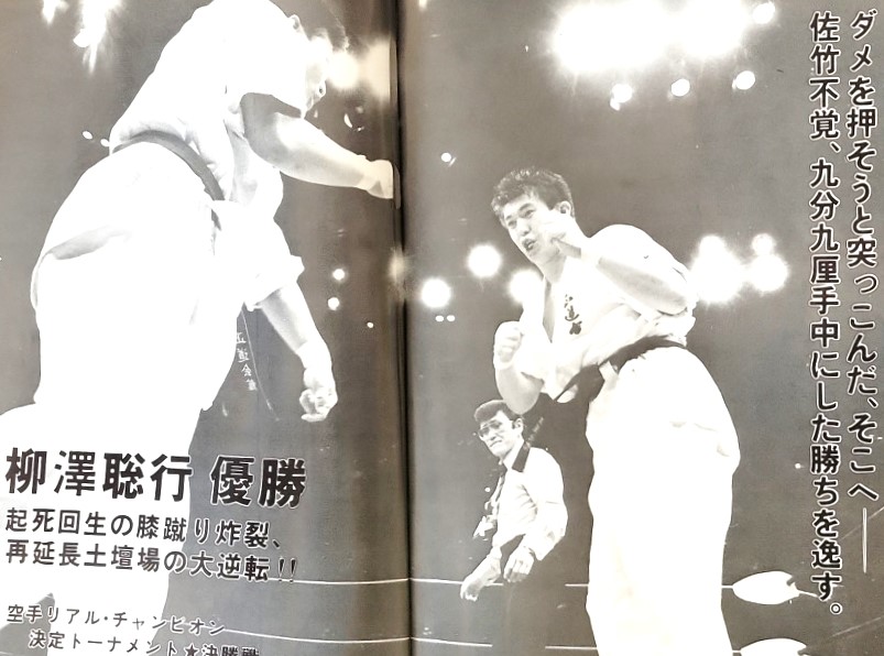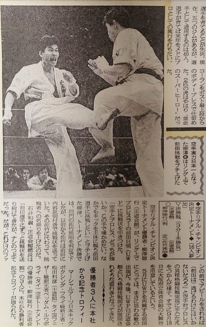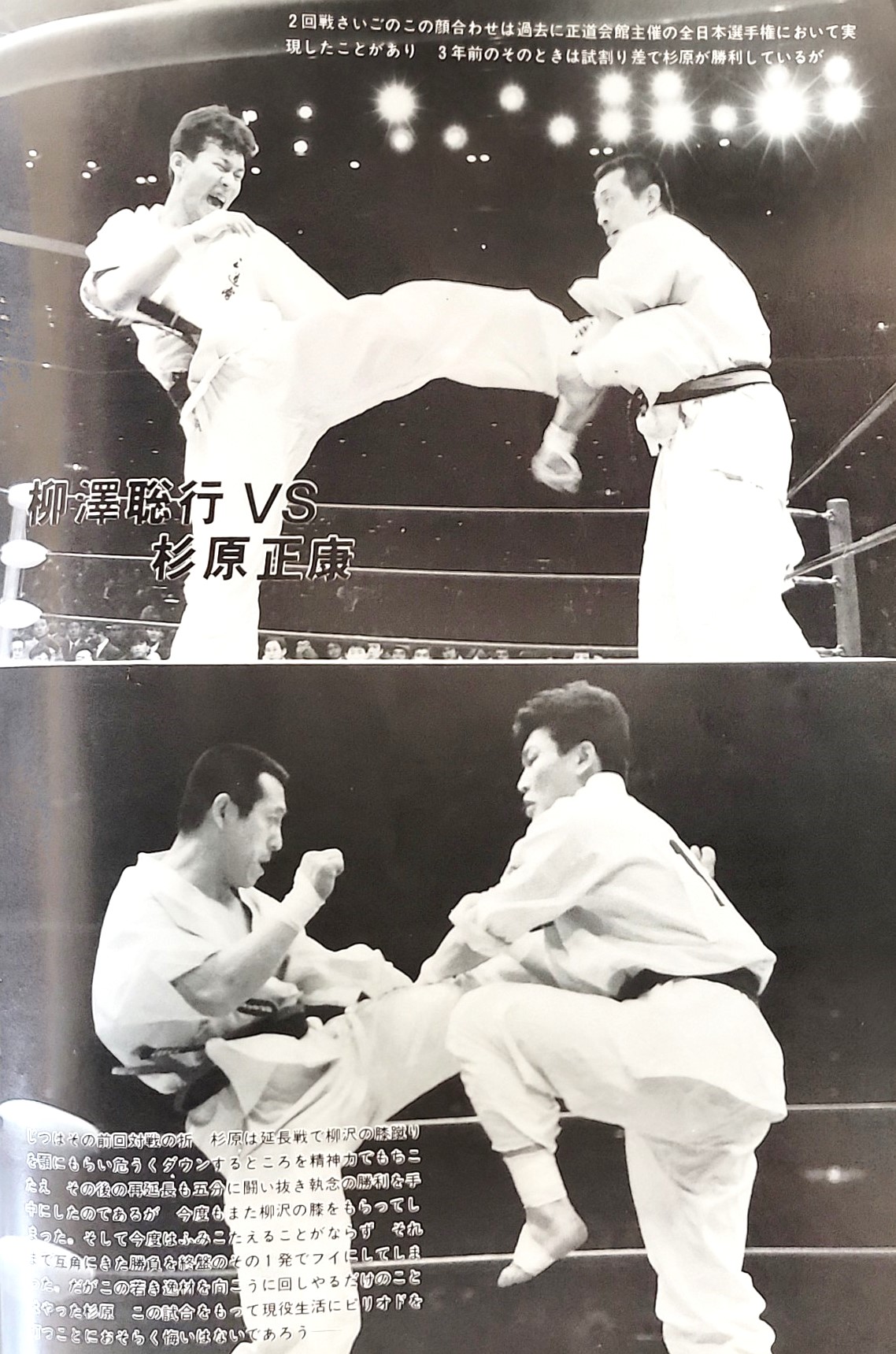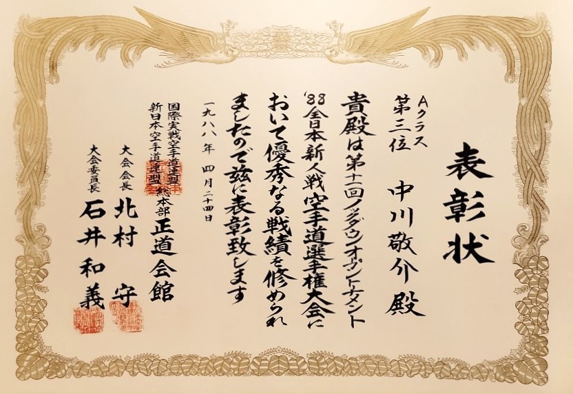 正道会館九州空手道選手権大会から約2週間後の1988年4月2日両国国技館で梶原一騎先生の追悼記念試合として『格闘技の祭典』が開催されました。この大会ではプロレス、女子プロレス、キックボクシング、シュートボクシング、そして初代タイガーマスクの佐山聡さんが創ったシューティング等色々な格闘技の選手が試合やデモンストレーションを行なう等夢のような大会でした。その中の目玉として実戦空手主要団体の全日本大会優勝者、準優勝者にのみ出場資格が与えられた『空手リアルチャンピオン決定トーナメント』が開催されました。正道会館からは佐竹雅昭先輩、川地雅樹先輩、今西靖明先輩、柳澤聡行さんの4名が出場しました。各流派の代表選手が集い16名でトーナメントを争うのですが本当に1回戦から決勝戦なみの好カードが目白押しでした。私も先輩達のセコンドで間近で試合を観ることが出来とても興奮した事を今でも鮮明に憶えています。最終的に決勝戦まで駒を進めたのは佐竹先輩と柳澤さんで正道会館同門対決となりました。大方の予想は佐竹先輩の勝利だったと思います。しかし柳澤さんは気持ちで全く引くこと無く試合は再延長戦までもつれ込みました。再延長戦はやや佐竹先輩に分があるように思いましたが佐竹先輩がダメ押しで攻め込もうとした所を柳澤さんの得意技上段膝蹴りが顎に決まり一瞬佐竹先輩の動きが止まったように思いました。すかさず攻め立て追撃した所で太鼓が鳴り終了。判定の結果柳澤選手の逆転勝ちとなり会場は大歓声に包まれました!この時の柳澤さんは常に気合いを出し続けながら戦っていて本当にカッコ良く私も刺激を受けました。それから3週間後の4月22日に大阪府立体育会館柔道場で第11回全日本新人空手道選手権大会が開催され私もAクラスにエントリーしていました。新人戦とはいってもAクラスには全日本入賞実績もある松本栄治君や田前純三さん武澤伸光さん藤田実君など少人数ながら強豪選手も出場しておりました。実はこの大会の映像も写真も残っていなくてあまり記憶にありません。憶えているのはAクラスの組み合わせは当日抽選で決定する方式で私は初戦で北海道支部の選手と戦い勝利し、準決勝戦では士道館全日本準決勝で戦った藤田実選手と再び戦い敗退した事です。3位に入賞しているのは手元にある表彰状で分かったくらいで入賞していた記憶も3位決定戦を誰と戦ったのかも全く憶えておりません。憶えているのは藤田君との試合は自分から途中で投げ出したような一番やったらダメで自分自身が一番嫌いな試合内容で負け、試合後に応援してくれていた正道会館後援会の社長さんに『中川何をやってんや』と怒られた事です。格闘技の祭典での柳澤さんの戦いを観て刺激を受けた私でしたが、選手としてデビューしてからの4年間で11回大会に出場し4位1回、3位2回、準優勝3回と善戦するも一度も優勝する事が出来ず、少し精神的にしんどくなってきていたように思います。試合も接戦が多かったので一度楽になりたいという気持ちがこの試合で出てしまったのかもしれません…。